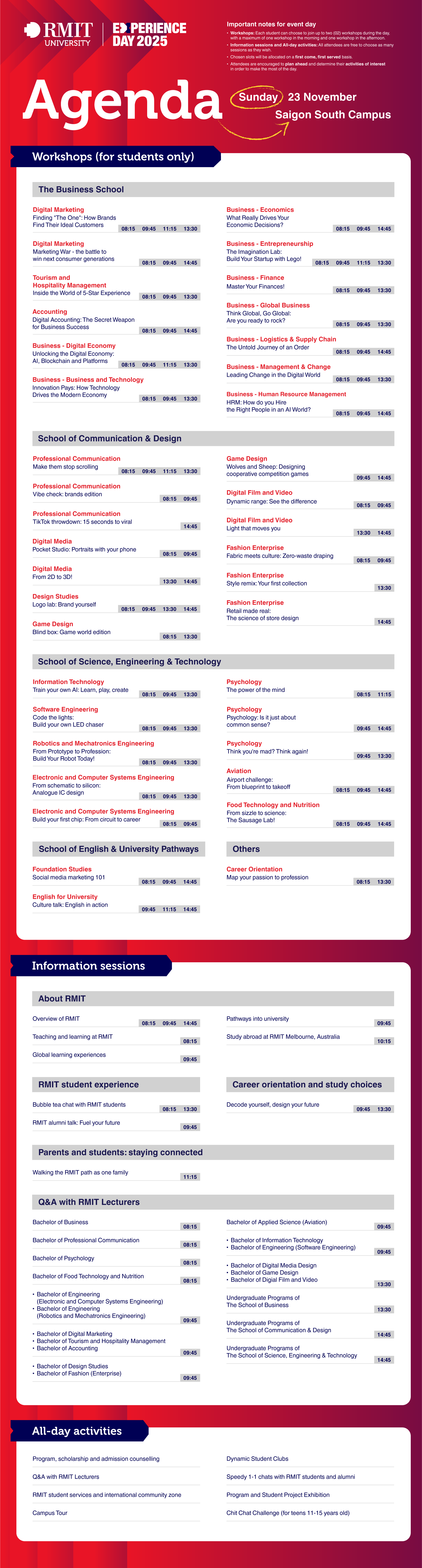 - Check out the activities you prefer in advance and arrive at RMIT on time to secure your spot