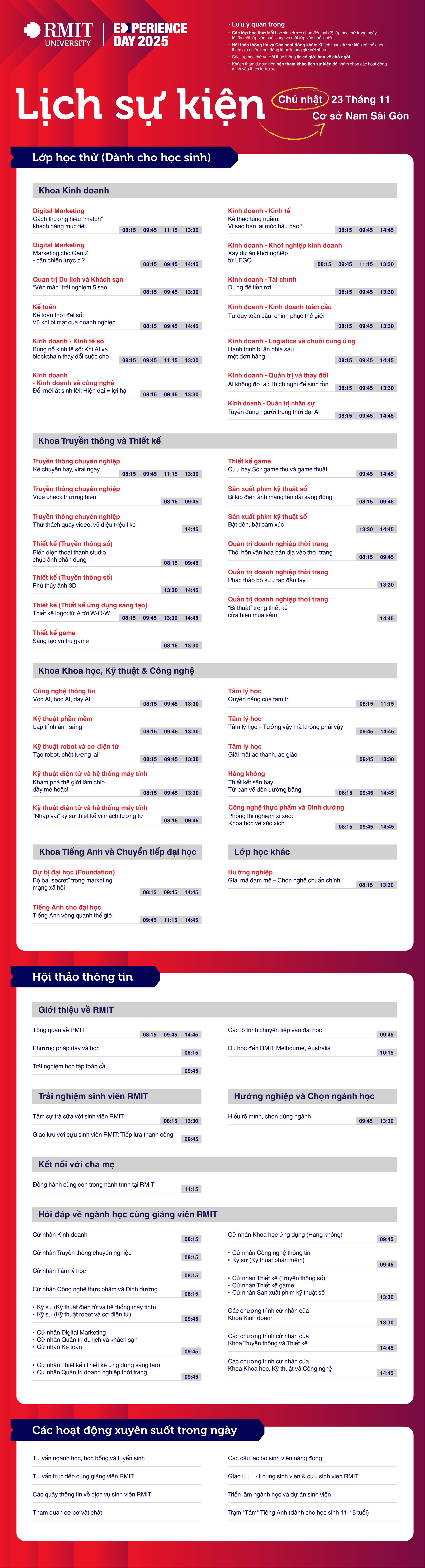 - Tham khảo trước các hoạt động bạn yêu thích và đến RMIT đúng giờ để giữ chỗ cho các hoạt động này.